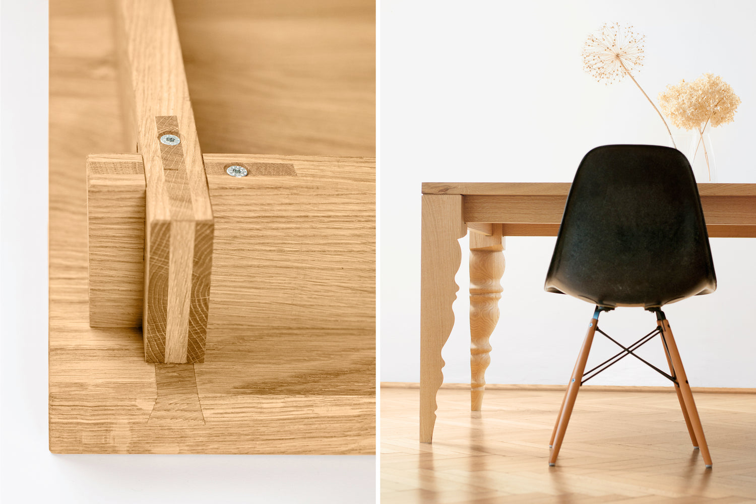 Eine zeitgenössische Silhouette und Tischbeine, die klassisch gedrechselt und kantig modern zugleich sind. Das ist unser massive Eichentisch Maria. Sie lässt sich in keine Schublade stecken. Und funktioniert mit Designklassikern genauso wie mit einem alten Wirtshausstuhl.